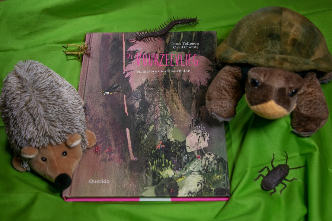 Op de kalender staat: vrijdag 4 oktober – Werelddierendag. Mooi. Dat dieren een speciale feestdag hebben, bedoel ik dan. Wat ook heel fijn is: dat er veel prachtige prentenboeken over dieren zijn. Leuk om uit voor te lezen. Heel af en toe verschijnt er een meesterwerk. Zo eentje waar je even moet bij gaan zitten, om te bekomen van hoe geweldig goed het wel is. En weet je wat? Vandaag kreeg ik zo’n heel bijzonder nieuw boek in handen: het weergaloos mooie prentenboek ‘De vuurzeevlieg en andere dierenverhalen’.
