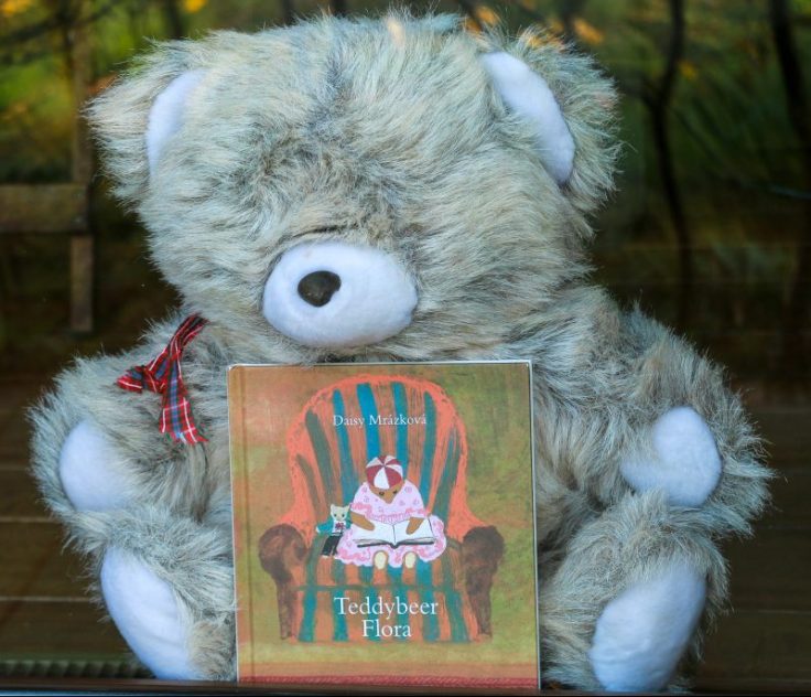 Ook bij ons stond een knuffel achter het raam, en tussen zijn pootjes toonde hij fier nog een andere prentenboekenparel: Teddybeer Flora van Daisy Mrázková. Want ik dacht zo: waarom zouden we er niet meteen ook een knuffelberenboekenjacht van maken?